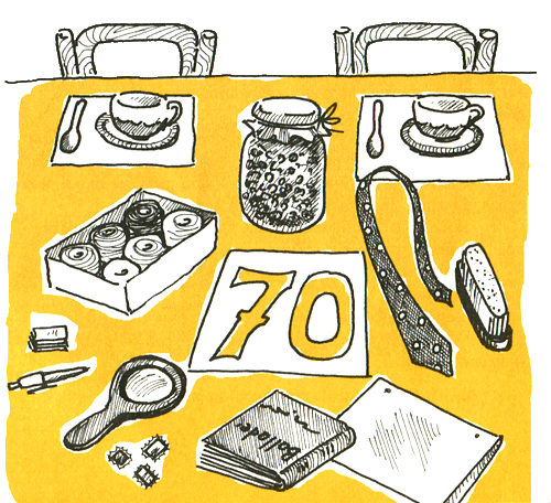 Большой стол был празднично накрыт. Фрау Зомер достала сегодня самые нарядные чашки, а посреди стола были выставлены подарки дедушке Зомеру: банка компота из крыжовника, набор разноцветной шерстяной штопки, ярко-красная шариковая ручка, стопочка билетиков на трамвай, галстук в горошек, лупа, одёжная щётка с белоснежной щетиной, сборник баллад, папка для газет и три японские почтовые марки. Но почтовые марки были почти не видны, зато на самом видном месте красовался кусок картона с наклеенной цифрой «70», вырезанной из золотой бумаги.