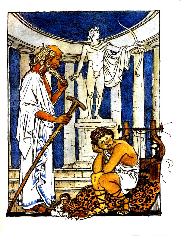 Вчера, когда я проходил по городскому рынку близ храма Артемиды, я увидел толпу юношей; они, горячась, обсуждали какие-то вести. Я прислушался к их речам и узнал о славных замыслах. В далёком Иолке Язон, сын Эсона, собирает могучую дружину, чтобы плыть за Золотым Руном, за сокровищем Эолйдов, Фрикса и Геллы. Мышцы твои крепки, Геракл, взор твой ясен. Послушайся меня: ступай в Иолк, к Язону. Много подвигов совершит он на своём пути, и, если ты вместе с ним прославишь добрыми делами своё имя, боги простят тебе твой проступок…