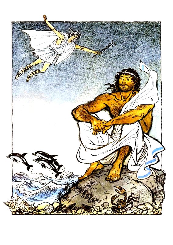 Но боги предназначили ему судьбу, отличную от судьбы аргонавтов. Когда однажды, сойдя на берег маленького островка, он углубился в лес, чтобы по приказу Язона заменить сломанное весло новым, в чаще деревьев встретил его лукавый и быстроногий Гермес, юноша с птичьими крылышками на круглой шапке и с другой парой крыльев на задниках лёгких сандалий.