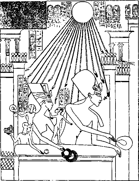 Эхнатон с царицей и тремя дочерьми на балконе своего дворца. Эхнатон раздает подарки, а в небе над ним сияет лучезарный Атон, лучи которого заканчиваются человеческими руками.