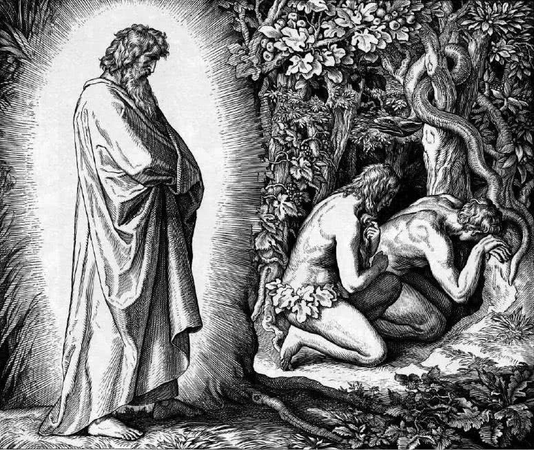 Сюжет Библии известен каждому, кто хотя бы немного знаком с христианской культурой. Бог создал Адама и Еву и поселил в раю, наказав: «…плодитесь и размножайтесь…» (Бт. 1:28). Оба были наги, но не стыдились этого. Однако при этом настрого запретил им есть яблоко с Древа познания добра и зла. Но тут им повстречался змей, который убедил Еву, что ничего страшного не будет. Она и сама съела, и Адама угостила. «И открылись глаза у них обоих, и узнали они, что наги, и сшили смоковные листья, и сделали себе опоясания» (Бт. 3:7). Разгневанный Бог сказал Еве: «…умножая умножу скорбь твою в беременности твоей; в болезни будешь рождать детей; и к мужу твоему влечение твое, и он будет господствовать над тобою», – и выслал грешников из сада Эдемского (Бт. 3:16).