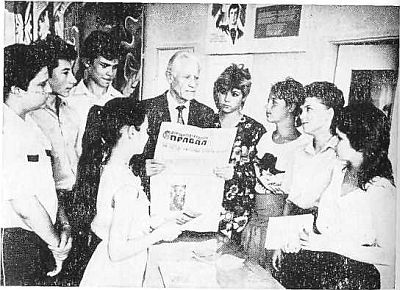 Чекисты управления госбезопасности ведут патриотическую работу с молодежью области. На снимке: подполковник в отставке А. Д. Малин беседует с учащимися СШ № 24 города Ворошиловграда