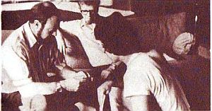 С космонавтом Эдгаром Митчеллом (слева) и ученым-металловедом из Кентстейского университета Уилбором Франклином. Капитан Митчелл учит Геллера, как проращивать семя, используя только энергию своего ума.