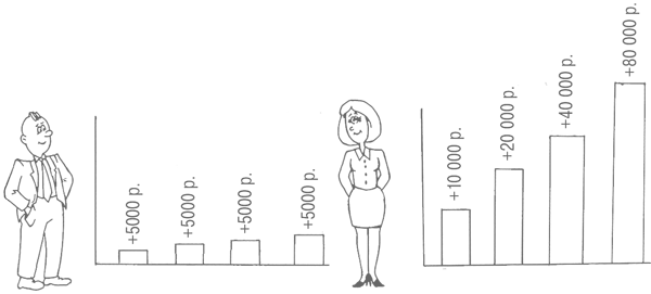 практически в геометрической прогрессии.Сначала 30 000, через 2 года – 60 000, через 3 года – 200 000, еще через 3 года – 600 000.