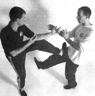Другими словами, если противник пытается ударить вас ногой с близкого расстояния, то, как только он оторвет ногу от земли (это можно отработать в Чи сао или Чи герк), поднимите свою ведущую ногу, не давая сопернику возможности прижать ее к земле, и ударьте по его опорной (или бьющей) ноге, отбрасывая ее назад (Рис. 20, 21).