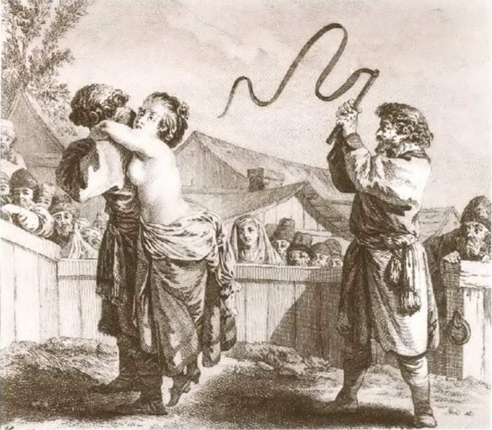 Наказание кнутом. Иллюстрация к книге «Путешествие в Сибирь» аббата Шаппа д'Отроша. Ж. Лепренс. Середина XVIII в.