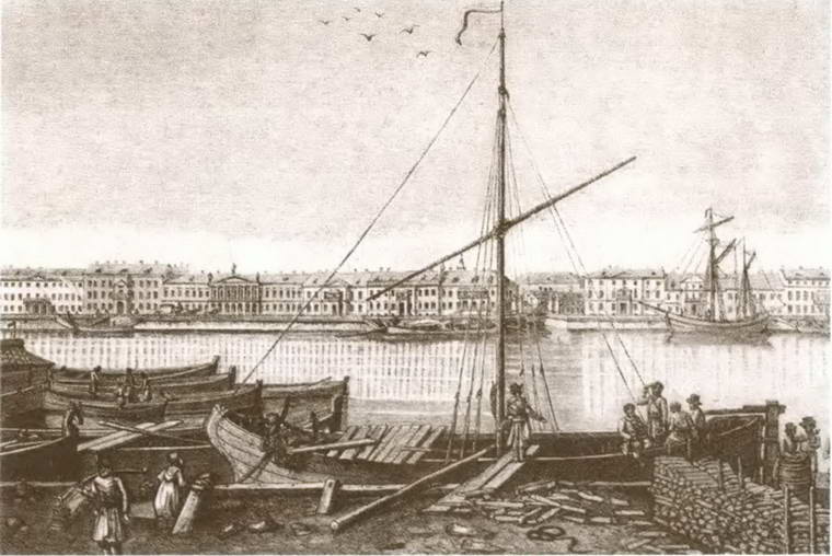 Вид Английской набережной с Васильевского острова в конце XVIII столетия. С гравюры Патерсона. 1796 г.