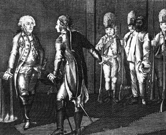 П. И. Панин принимает пленного Е. И. Пугачева у доставившей его воинской команды. Гравюра. XVIII в.