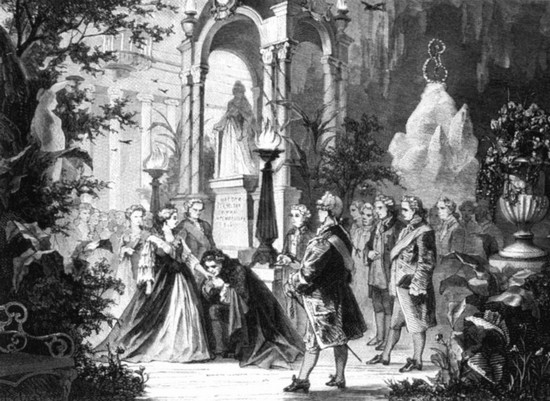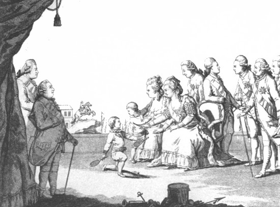 Екатерина II в окружении семьи и вельмож. «О подданные отменно счастливые! Она вас любит как своих детей». Гравюра. 1782 г.