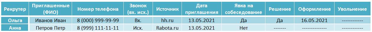 удобно использовать.Менеджеры по подбору и рекрутеры должны обязательно вести лонг-лист соискателей (если у вас нет автоматизированной программы подбора персонала). В нем мы указываем ФИО, должность, контактный телефон, источник, результат собеседования и т.д. Данный отчет ведется на постоянной основе. Он позволяет видеть работу рекрутеров, а так же видеть информацию по соискателям (на каком этапе находится кандидат, что произошло с ним на определенных этапах). Этот отчет менеджеры и рекрутеры ведут одновременно, каждый заполняет свои графы.