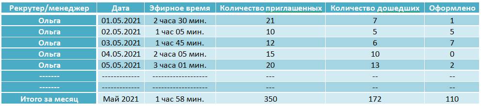 В таблице пример отчета одного менеджера, цифры показаны примерные. Эфирное время по итогам месяца мы берем за средний показатель, все же остальные показатели суммируются.