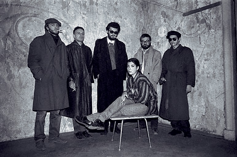 Младший инспектор МГ Владимир Фёдоров (Федот), старшие инспекторы МГ Сергей Ануфриев, ПП, Юрий Лейдерман, младший инспектор МГ Антон Носик, младший инспектор МГ Анастасия Михайловская. Сквот на Фурманном переулке, кв. 13. Москва, 1989 год