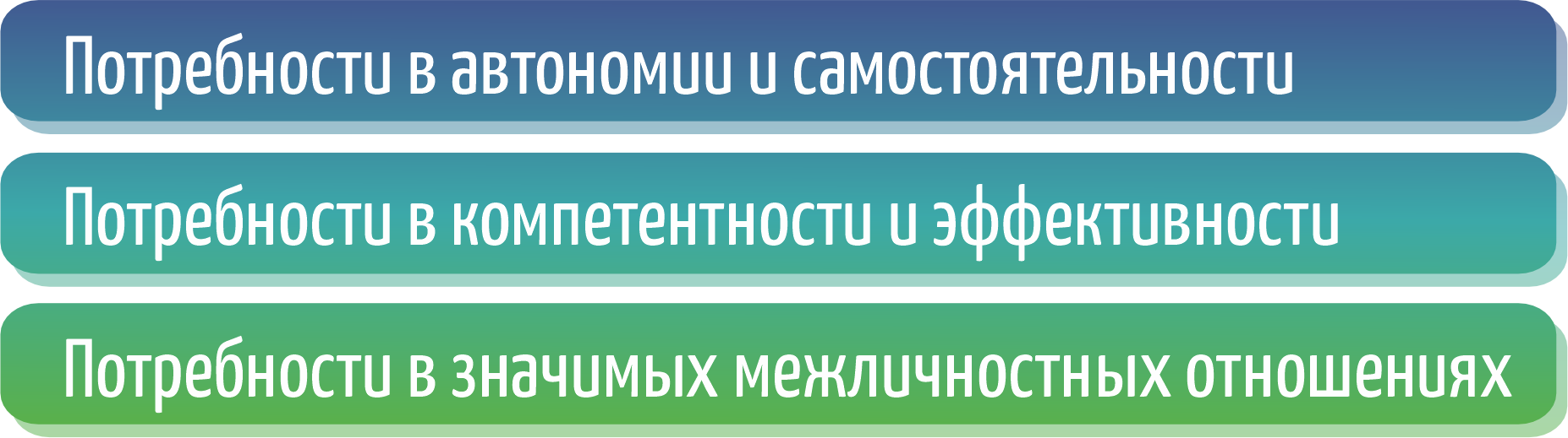 В последнее время потребностями человека занимаются и исследователи, придерживающиеся теории самодетерминации (врожденной склонности человека к вовлечению в интересующее его поведение и свободы выбора способа поведения), в которой большое внимание уделяется трем базовым психологическим потребностям. Об этих потребностях желательно знать и родителям современных детей. По мнению ученых, к этим потребностям относятся: