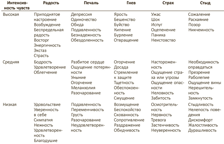 навыков управления своими эмоциями, связанными с каждой новой задачей или проблемой, встающей перед нами. Для принятия хороших решений нужно что-то еще, помимо знания фактов. Основа хороших решений находится в понимании самого себя и управлении эмоциями в наиболее нужный для этого момент.Пять основных эмоций перечислены в верхней строке. Различные выражения каждой из эмоций приведены в соответствующих колонках
