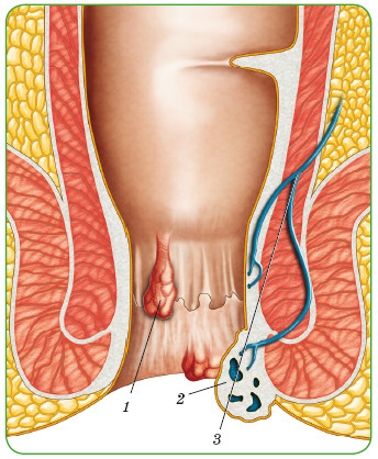 геморроидальные узлы. Слово «геморрой» переводится как «кровотечение». Признаки геморроя, хотя бы однократно, отмечают до 60 % населения.Геммороидальные узлы: 1– общий вид; 2 — поперечный разрез; 3 — вена