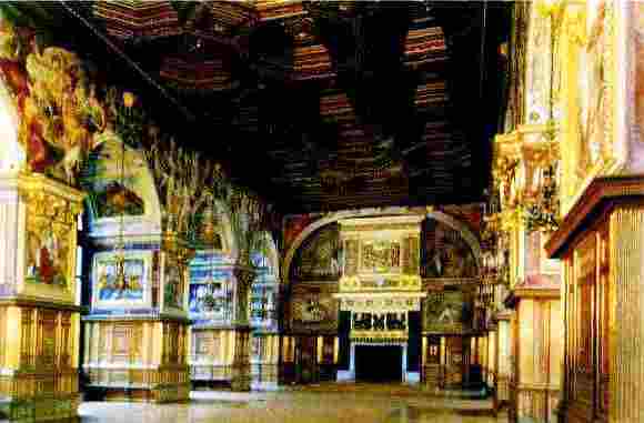 В другой своей картине Шонгауэр представил Святое Семейство в скромном интерьере небольшой комнаты. Золотисто-оливковый цвет стен, напоминающий о золотом фоне более ранних изображений святых, красиво дополняют яркие пятна одеяний: платье Богоматери сдержанно-красного цвета, Святой Иосиф (муж Богоматери) — в тёмно-синих одеждах. Мария сидит на фоне ниши, в которую помещена фляга с вином (символ евхаристии) [134] , а фигурка Младенца Христа осенена большой аркой, под которой стоит Святой Иосиф. Этот приём придаёт образу Младенца особую значимость: Его маленькой фигурке художник отвёл большее архитектурное обрамление, чем фигуре Богоматери.