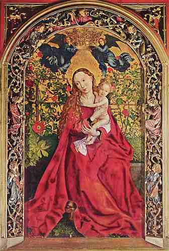 Единственная точно датированная работа М. Шонгауэра «Мадонна в беседке из роз» (1473 г.) — картина почти двухметровой высоты. Мадонна Шонгауэра — женщина с милым простым лицом, воплощение земного материнства. Складки её алого платья ниспадают широко и плавно. Она изображена в обрамлении розовых кустов; на фоне золотого неба чётко выделяются чёрные шипы, алые цветы и фигурки сидящих на ветках щеглят.