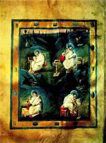 В конце VIII в. под покровительством Карла Великого была основана книгописная мастерская в Ахене. В миниатюрах, созданных здесь, художники использовали и варварские, и античные традиции. Сложное плетение узоров, пурпур и золото придавали миниатюрам великолепие. Впервые в средневековой Западной Европе в них появились изображения человека — евангелистов в величественных и торжественных позах, как правило с книгой и пером в руках.