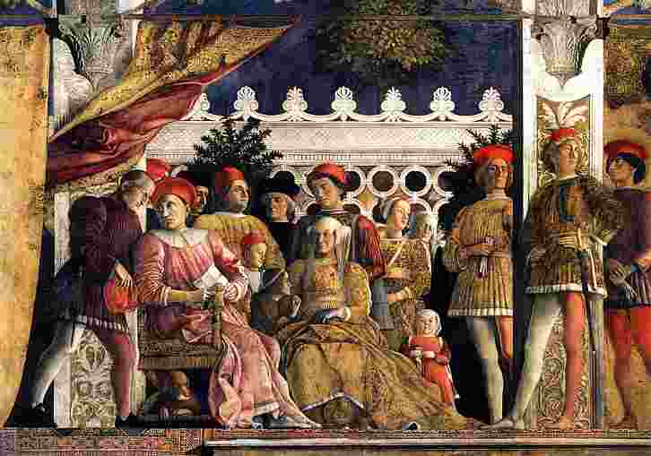 При всей нарядности и красоте оформления этой парадной комнаты посетителей в первую очередь восхищали росписи на северной и западной стенах. На них изображены важнейшие моменты фамильной истории маркизов Гонзага, сцены из жизни их двора.