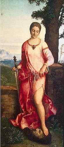 Известно лишь несколько картин мастера, написанных маслом. Джорджоне — художник тонкой поэзии, глубокого лирического чувства, скрытых переживаний. Музыка, меланхолия, созерцательное настроение — естественное содержание его картин, в которых как будто нет сюжета, нет и активного действия, но присутствует порой сложный подтекст. Вместе с тем творчество Джорджоне человечно, полно пленительной красоты, сохраняет вечную волнующую привлекательность. Главную роль в его живописи играет колорит с многообразием тонов и их мягкими переливами. Одна из ранних работ Джорджоне — «Юдифь» (около 1502 г.) — посвящена подвигу библейской героини Юдифи, спасшей родной город от нашествия ассирийцев. Она отправилась в стан врагов и убила их полководца — Олоферна. Войско неприятеля отступило. Прекрасная кроткая Юдифь олицетворяет в картине высшую справедливость.