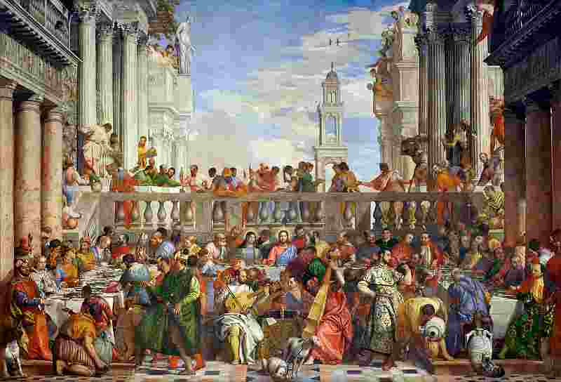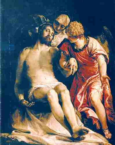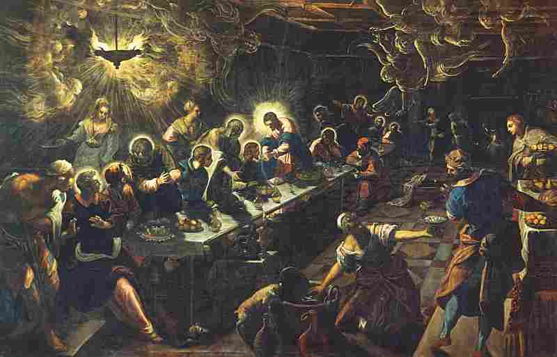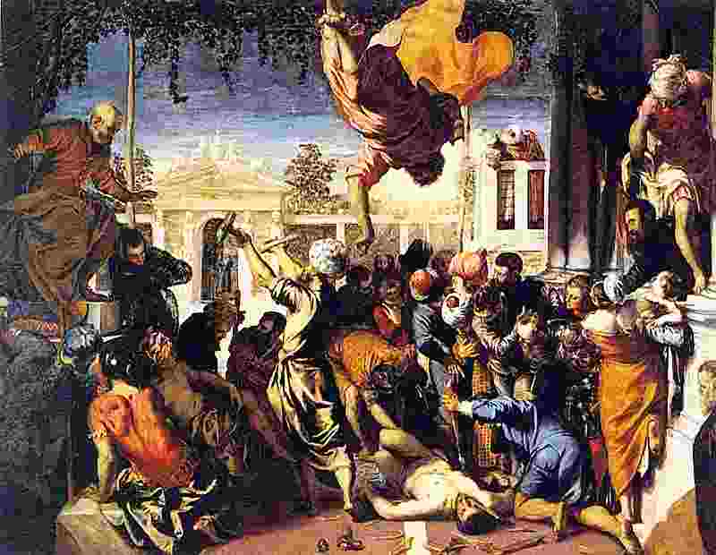 Оформление Скуолы ди Сан-Рокко мастер начал с создания грандиозной монументальной композиции «Распятие». Изображение со множеством персонажей — зрителей (мужчин и женщин), воинов, палачей — полукольцом охватывает центральную сцену распятия. У подножия креста близкие и ученики Спасителя образуют редкую по духовной силе группу. В сиянии красок на сумеречном небе Христос будто охватывает руками, пригвождёнными к перекладинам креста, беспокойный, волнующийся мир, благословляя и прощая его. И в поздние годы жизни Тинторетто привлекали массовые сцены. Созданная им для Дворца дожей «Битва при Царе» (около 1585 г.) занимает целую стену. В сущности это первая подлинно историческая картина в европейской живописи. Для того чтобы передать в картине напряжение битвы, мастер использовал беспокойный ритм линий, цветовые удары, вспышки света. Вся в движении, картина словно отражает бурное столкновение стихий.