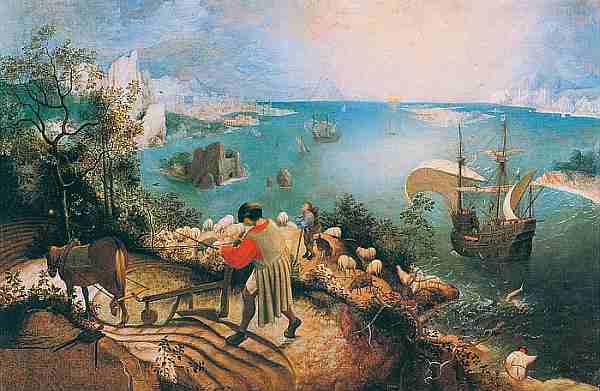 На картине «Обращение Савла» (1567 г.) [125] изображён вооружённый отряд, взбирающийся по крутой горной тропе. Позади, внизу, остались гладь озера и закатное небо. Маленькая армия готова скрыться в темноте; последние лучи солнца светят в спины уходящим. Но вот их движение замерло: конные и пешие сгрудились вокруг неприметной фигурки упавшего с коня предводителя отряда. Он привстаёт, опираясь на локоть, лицо его обращено в сторону заходящего солнца — он отважился обернуться к свету и теперь ослеплён ярким сиянием закатных лучей. Примечателен внешний облик упавшего. Его борода и орлиный нос — канонические черты Савла Тарсиянина, но они же напоминают и другого человека, современника Брейгеля, дона Фернандо Альвареса де Толедо, герцога Альбу (1507–1582).