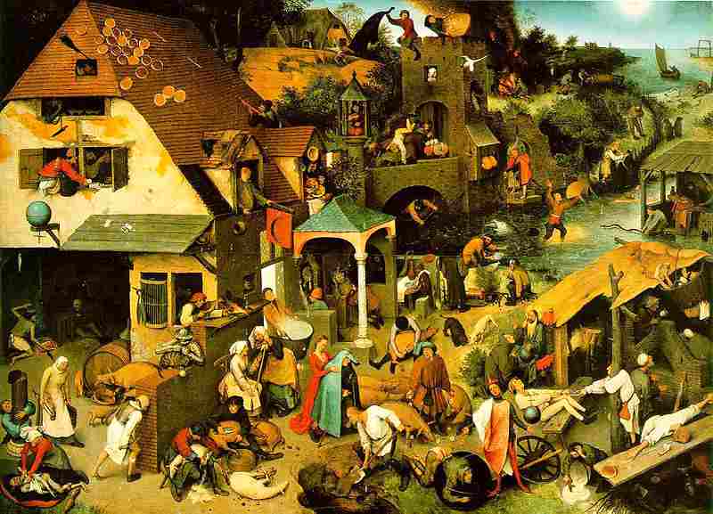 Эта картина создана в 1559 г. и ныне находится в собрании Берлинских Государственных музеев (Музей Берлин-Далем). Это своеобразная энциклопедия нидерландского фольклора. В сравнительно небольшом живописном пространстве (размеры полотна 117х163 см) художник поместил более ста иллюстраций к народным пословицам, басням, поговоркам и прибауткам. Смысл некоторых из них понятен русскому зрителю без объяснений: персонажи Брейгеля водят друг друга за нос, садятся между двух стульев, бьются головой о стену, висят между небом и землёй; другие же лишь отдалённо напоминают русский фольклор, но содержание их тем не менее понятно. Например, нидерландская поговорка «И в крыше есть щели» близка по смыслу к русской «И стены имеют уши». «Бросать деньги в воду» означает то же, что и «сорить деньгами», «пускать деньги на ветер» и т. п.