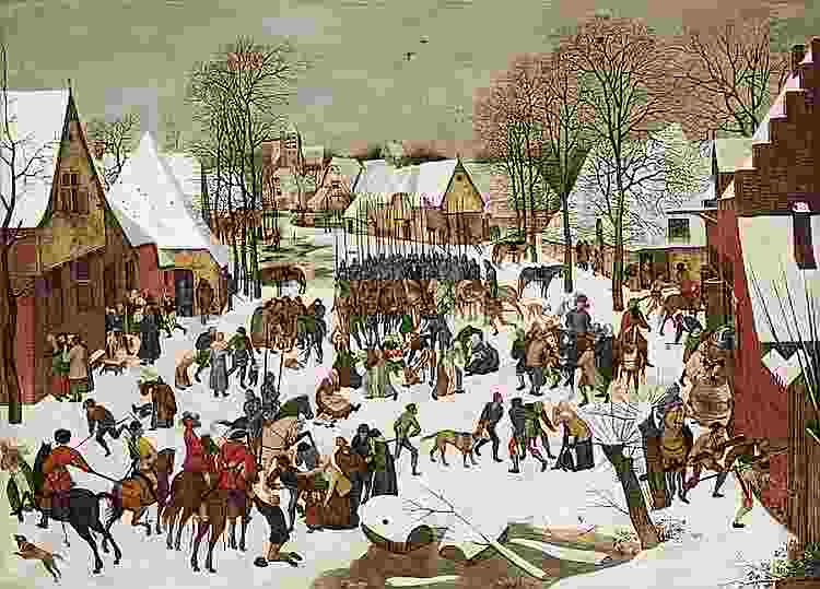 Как отголосок этих бедствий воспринимается картина Брейгеля «Избиение младенцев в Вифлееме», созданная в 1566 г. (Согласно Евангелиям, царь Иудеи Ирод, узнав о рождении Христа в Вифлееме, повелел умертвить всех младенцев в этом городе.) На картине изображено нидерландское селение, в которое пришли враги. По заснеженной деревенской площади мечутся каратели и их жертвы. В глубине композиции, в окружении закованных в сталь всадников виден человек, руководящий расправой, — суровый длиннобородый старец в чёрном. Этому неумолимому посланцу царя Ирода художник, сознательно или невольно, придаёт портретное сходство с герцогом Альбой. Жуткий смысл происходящего не сразу доходит до сознания зрителя: со стороны трагедия в Вифлееме выглядит почти буднично. Земля спокойна и величава в своём белоснежном убранстве. Кажется, сама природа отторгает от себя людскую жестокость, ужас и горе. Истина жива даже в безжалостный век, и её можно отыскать не только в Священном писании, но и на страницах вечной книги природы.