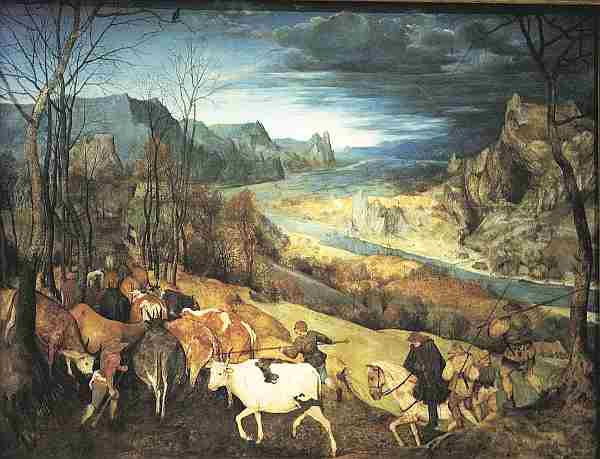 Брейгель отказался от традиционного изображения нидерландского пейзажа, он как бы сузил свой кругозор: заставил зрителя всматриваться в незамысловатые сцены деревенских будней. Цикл картин «Месяцы» («Времена года»), созданный Брейгелем в 1565 г., воспринимается как целая вселенная, воплощённая художником в безыскусных и неприметных сельских видах. Красота земли в каждом миге её бытия для Брейгеля — залог существования некоего вселенского закона, гораздо более мудрого и милосердного, чем установление земных владык.