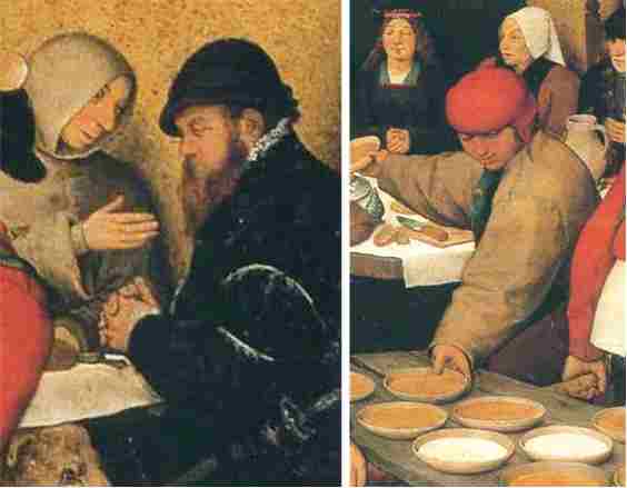Картины «Крестьянская свадьба» и «Крестьянский танец» написаны Брейгелем в 1566–1567 гг., т. е. в самое тяжёлое и тревожное для его народа время. Эти изображения праздничного торжества простых людей стали ответом художника на царившее повсюду горе. Жизнь в Нидерландах с приходом герцога Альбы не прекратилась. Вот крестьяне играют свадьбу. Конечно же, тесная деревенская хижина не подошла для брачного пира, поэтому гости собрались в чисто убранном большом сарае. Дверь его снята с петель и используется в качестве своеобразного подноса. У входа теснится толпа народа. Не все из пришедших решились переступить порог, так как в те годы как раз был оглашён особый указ испанского короля: число гостей на крестьянских свадьбах не должно превышать двадцати человек. Именно поэтому в сарае достаточно просторно и ни один из участников празднества не обойдён вниманием живописца: ни темноглазый музыкант с восторженно-удивлённым лицом, ни малыш в съехавшей на глаза шапке с павлиньим пером, который старательно вылизывает свою тарелку, ни могучий виночерпий, склоняющийся над кувшинами.