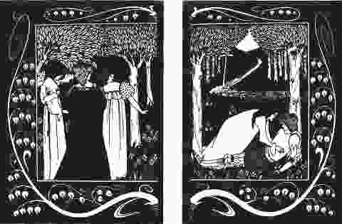Обаяние эпохи Ренессанса нельзя не почувствовать в первой крупной работе Бёрдсли — иллюстрациях 1893–1894 гг. к книге «Смерть Артура» английского писателя XV в. Томаса Мэлори. Она была создана по мотивам старинных легенд о короле Артуре и рыцарях «Круглого стола». Большая часть изображений построена на контрасте тёмного фона и светлых фигур, прорисованных изящными линиями. Движения фигур, декоративный рисунок цветов, деревьев, морских волн отличаются утончённой гибкостью. Пейзажи с тенистыми парками и средневековыми замками, например в сцене «Артур [143] и чудесная мантия» или «Четыре