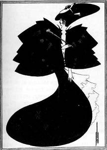 Иные грани творческого облика Бёрдсли раскрываются в иллюстрациях к пьесе английского писателя Оскара Уайльда «Саломея» (1894 г.). В них он дерзок, экстравагантен, язвителен. Рисунки, выполненные на светлом фоне, завораживают игрой линий и силуэтов. Так, на листе «Чёрный капот», изображающем Иродиаду, жену Ирода, героиня наделена современным обликом, а её причудливое чёрное одеяние не что иное, как тонкая стилизация моды конца XIX в. Огромные рукава, похожие на крылья бабочки, юбка, которая словно растеклась широким овальным пятном, изысканное маленькое лицо — всё складывается в странный образ, полный очарования и одновременно вызывающий страх. Персонажи рисунков Бёрдсли ассоциируются с миром нечистой силы: уродливое существо аккомпанирует Саломее [145] в сцене танца, а локоны Иродиады, держащей голову Иоанна Крестителя, напоминают рога.