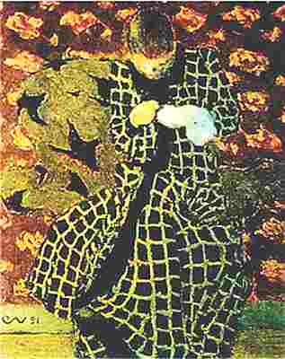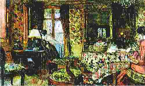 Необычайно тонким колоритом отличается картон «В комнатах» (1904 г.). Вюйяр не пропускает ни одной мелочи интерьера: перед зрителем столы, стулья, коврики, вазы, печка. Но это не «перепись имущества», а жизненная среда; её серовато-голубые оттенки словно говорят о зиме и холодах.