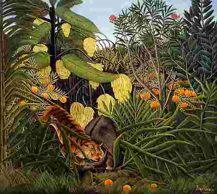 В картине «В тропическом лесу. Нападение тигра на быка» (1908 г.) художник погружается в зачарованный мир тропического леса. Каждый лист, каждая ветка тщательно выписаны. Огромные жёлтые и красные цветы тянутся к небу. В центре композиции тигр вцепился в загривок буйвола, а тот стремится поддеть его на рога. Подобные пейзажи Руссо отчасти копировал с фотографий, отчасти придумывал. Но он настолько верил собственному воображению, что, по его словам, очень боялся своих диковинных хищников, охотящихся в джунглях.