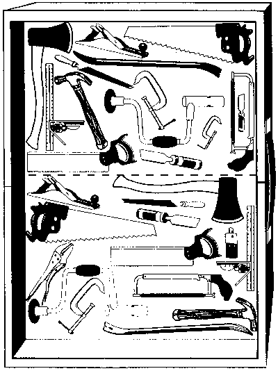 По старинной традиции плотник держал два набора инструментов — для себя и для своего ученика. Однако 4 инструмента, предназначенных для ученика, были меньшего размера. Найдите их на рисунке.