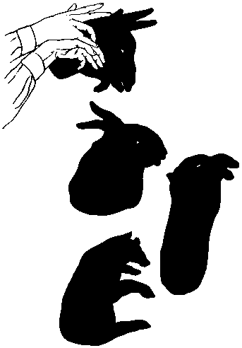 Попробуйте с помощью пальцев изобразить на стене тени в виде животных. На рисунке показано, как изобразить козу. А вы сможете показать кролика, верблюда и медведя, которые изображены здесь?
