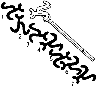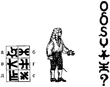 Один ученый в XVIII в. изобрел новый алфавит, в котором читатель мог понять последовательность букв, исходя только из их начертания. Этот алфавит был представлен в виде вот таких символов. Какой из 6 символов, изображенных в прямоугольнике, должен стоять в этом ряду вместо знака вопроса?