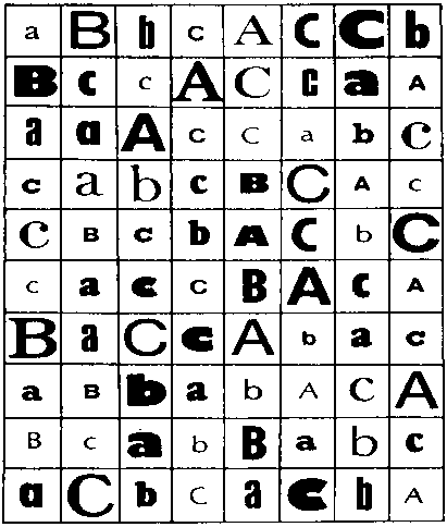 В этом лабиринте надо начинать путь с правого нижнего угла (буква А). Далее идите на В, затем на С и продолжайте, соблюдая эту последовательность: А-В-С, А-В-С. Идти разрешается по вертикали, горизонтали или по диагонали. Вы должны выйти из лабиринта в верхнем левом углу (буква «а»). Какой же путь самый короткий?