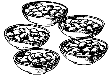 На рисунке — 100 орехов в 5 мисках. В первой и второй мисках вместе — 52 ореха. Во второй и в третьей — 43, в третьей и четвертой — 34, в четвертой и пятой — 30. Сколько орехов в каждой миске?