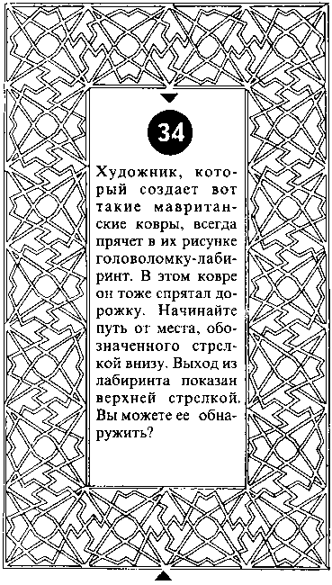 Художник, который создает вот такие мавританские ковры, всегда прячет в их рисунке головоломку-лабиринт. В этом ковре он тоже спрятал дорожку. Начинайте путь от места, обозначенного стрелкой внизу. Выход из лабиринта показан верхней стрелкой. Вы можете ее обнаружить?