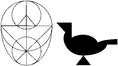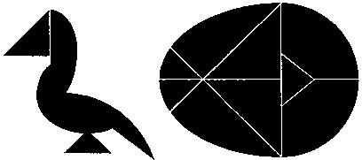 кусочков этого волшебного яйца можно сложить пеликана или голубя, изображенных на рисунках. Можете ли вы сложить из этих кусочков и пеликана и голубя одновременно, используя все детали яйца?Чертеж поможет вам сделать такое волшебное яйцо из картона или бумаги.