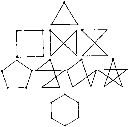 Существует только 1 способ соединения 3 точек последовательными движениями карандаша по прямой линии — так, чтобы карандаш вернулся в исходную позицию. Есть 3 способа соединения 4 точек, расположенных в вершинах квадрата, и 4 способа соединения вершин пятиугольника. А сколько способов соединения 6 точек (вершин шестиугольников) вы можете найти?