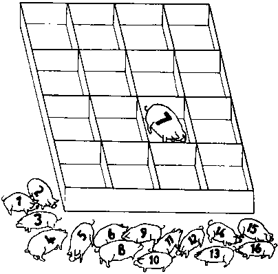 За каждые 4 свиньи хитрый фермер получал 34 доллара (цифра на боку свиньи — цена). Каждая свинья помещена в отдельном блоке. И не важно, выберет покупатель 4 свиньи по вертикали, горизонтали, диагонали или из углов свинарника — все равно он заплатит 34 доллара. Как это фермеру удалось?