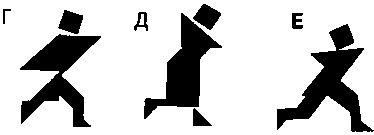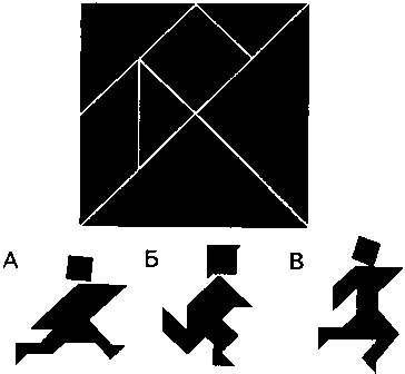 Перед вами китайская геометрическая головоломка. Попробуйте сделать таких бегущих человечков. Помните, что в каждой фигуре нужно использовать все 7 частей головоломки. Схема (рис. вверху) поможет вам сделать собственную головоломку из куска картона. Без этой схемы невозможно собрать квадрат из разных частей головоломки. Попробуйте — и поймете сами!