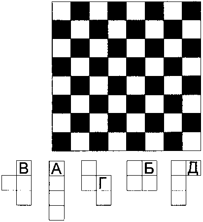 Эта фигура из 4 квадратов может иметь 5 разных форм, как показано на рисунке. 4 из них можно использовать как повторяющиеся фрагменты мозаики для покрытия стандартной шахматной доски — но не пятую форму. Какая из форм не подходит? Не забудьте, что нужно использовать каждую форму по отдельности (вам понадобится 16 копий каждой формы) и не смешивать их на одной шахматной доске.