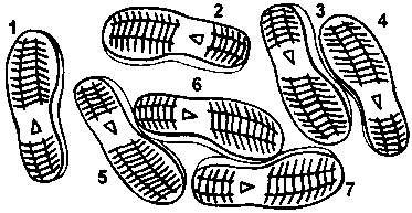 Какой ботинок из изображенных на рисунке сверху оставил след, аналогичный тому, что нарисован внизу?
