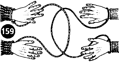 Если связать ваши руки с руками вашего приятеля, как показано на рисунке, каким образом вы сможете освободиться? При этом нельзя развязывать узлы и перерезать веревки!