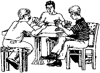 Трое мужчин играют в старинную карточную игру, по правилам у каждого игрока есть только одна карта. Каждый берет свою карту, не глядя в нее, и кладет перед собой так, чтобы два других игрока могли ее видеть. Если игрок видит у одного из своих партнеров карту черной масти, он поднимает руку. Побеждает тот, кто может первым определить, какой масти — черной или красной — карта у него самого.