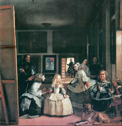 Картина «Менины» (1656) была знаменита уже при жизни Веласкеса. Португальским словом «менины» называли фрейлин королевских детей. На первом плане картины изображена инфанта Маргарита со своими придворными в мастерской Веласкеса в замке Алькасар. Фрейлина донья Мария Августина Сармьенто преклонила колено у ног инфанты, подавая ей кувшинчик с водой. Позади принцессы – донья Исабель де Веласко; около неё – карлица Мари Барбола и карлик Николасито Пертусато; далее – собака-мастиф, которую мальчик выталкивает ногой прямо на зрителя. Веласкес стоит слева с кистью и палитрой за высоким холстом. На стене комнаты развешаны картины, среди которых находится зеркало. На его туманно мерцающей поверхности видны отражения короля Филиппа IV и королевы Марии-Анны Австрийской. Картина, которую пишет Веласкес, обращена к зрителю задником. Что изображено на ней, навсегда останется тайной, которую пытались и пытаются разгадать историки искусства. В одной из последних работ «Пряхи» (ок. 1657 г.) мифологический сюжет (состязание ткачихи Арахны с богиней Афиной, превратившей девушку в паука) решён как жанровая картина. Изображены работницы королевской фабрики гобеленов, на заднем плане придворные дамы любуются шпалерой. Картина полна воздуха и света, растворяющего фигуры. Миф и реальность сливаются в волшебном красочном действе.
