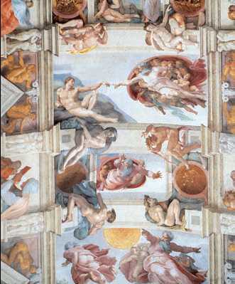 В 1508 г. Микеланджело получил от Папы Юлия II заказ на роспись потолка Сикстинской капеллы в Ватикане (1508-12). За четыре года Микеланджело в одиночку расписал более 600 м2 поверхности, создав величественный цикл композиций на темы Ветхого Завета. В сценах «Сотворения мира» мастер создал величавую поэму о титанической мощи Творца. Внутренним драматизмом и духовной силой веет от образов сивилл и пророков. Микеланджело работал кистью как скульптор, придавая фигурам неистовую пластическую энергию. Потолок Сикстинской капеллы – вершина творчества мастера, «потрясающее по своей мощи произведение, исполненное духом Бога-творца и разрушителя – грозного Бога, в котором воплощена бушующая,